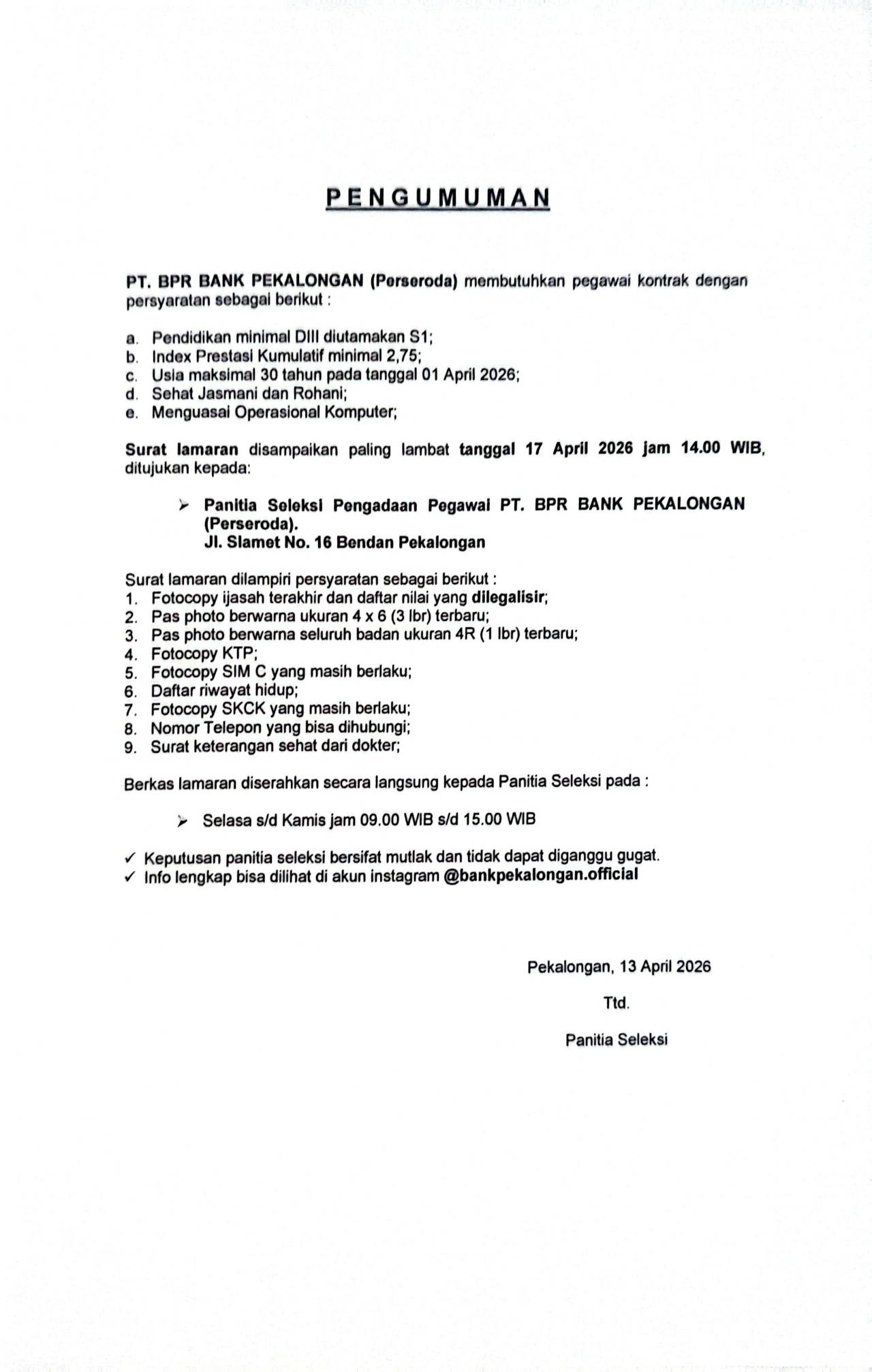 Lowongan Kerja PT. BPR BANK PEKALONGAN